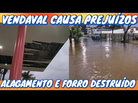 Forro da rodoviária foi destruído pelo vento, rua em frente o terminal alagou.